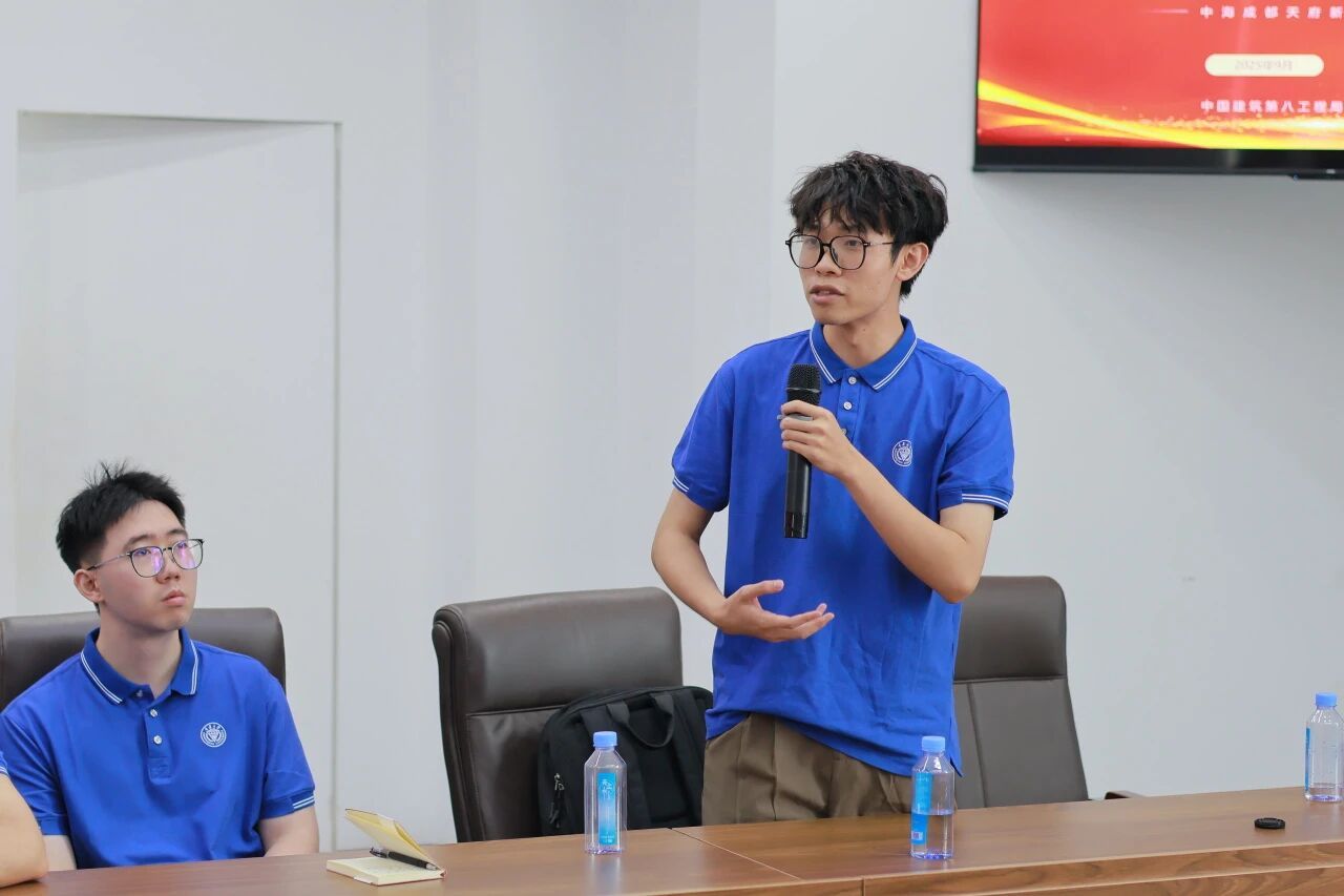展厅参观结束后,双方人员移步至项目会议室,开启校企交流环节。会议伊始,中海成都天府新区超高层项目经理陈斌对实践团的到来表示热烈的欢迎。参会人员共同观看了中建八局西南分公司的宣传片。通过影像资料,大家全面了解了公司的发展历程、业务布局、核心技术优势以及在社会责任履行方面的突出成果,对公司的综合实力有了更深刻的认识。