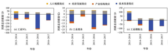 显然,在追求经济高质量发展,重视生态环境保护的情况下,长江经济带的工业污染减排效果显著。为揭示其工业污染排放的影响因素,本研究通过LMDI模型从技术改善、产业结构、经济发展和人口规模4个方面分析其对长江经济带工业污染排放的影响。结果显示技术改善对工业污染排放有显著抑制作用,其中建立工业集聚区污水集中处理设施、淘汰大量燃煤小锅炉、煤电机组脱硫设施实施增容改造、扩大脱硝机组容量以及重化企业搬迁退出等措施是长江经济带工业污染急剧减量的最主要原因。