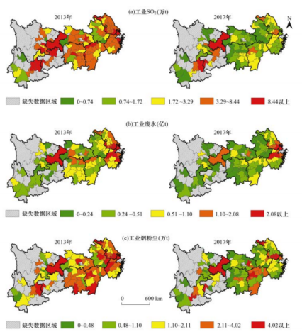 该研究以2013~2017年长江经济带102个城市的工业SO2、工业废水以及工业烟粉尘排放量作为基础数据,基于ArcGIS软件平台揭示研究区工业污染排放空间分布格局。2013~2017年,长江经济带的工业SO2、工业废水以及工业烟粉尘排放量呈降低趋势,高排放城市减少,低排放城市增多。