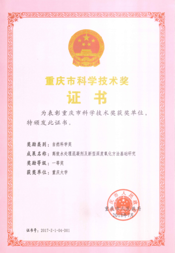 2 Study on the coagulant and new deep oxidation method for high efficiency water treatment ZHENG Huaili 2017 Chongqing Natural Science;First Prize;