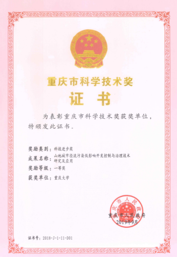 3 Research and application of low impact development control and treatment technology of runoff pollution in Mountainous Cities CHAI Hongxiang 2018 Chongqing Science and Technology Progress;First Prize;